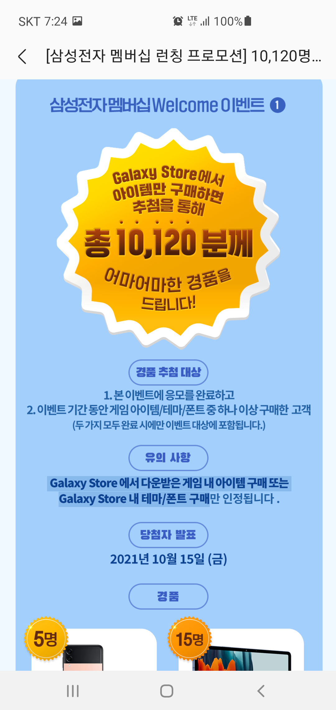 삼성전자 멤버십 웰컴이벤트를 통해 받을 수 있는 상품들을 보면 놓치기 아쉽다는 생각이 절로 듭니다. 갤럭시 Z플립3 5G 5명을 시작으로 갤럭시 탭 S7+5 15명, 갤럭시 워치4 100명 그리고 갤럭시스토어 기프트카드 3천원권이 10,000명에게 주어지는데요, 금액 상관없이 이벤트 기간 동안 게임아이템/테마/폰트 중 하나 이상 구매하면 참여 가능하니 이번 기회에 필요했던 아이템을 구매해보는 것도 좋을 것 같습니다.