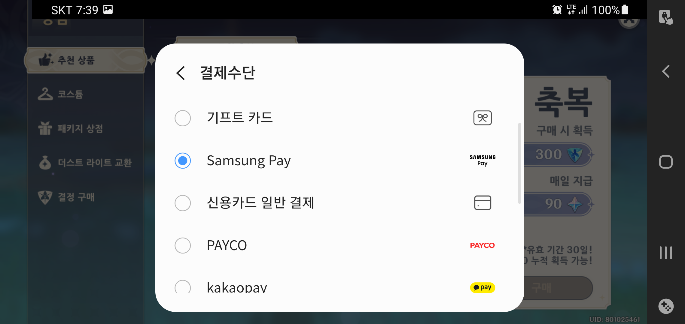 앞서 원신은 갤럭시 스토어에서 다운르도 받았기 때문에 별다른 번거로움 없이 필요한 아이템 구매가 가능했습니다. 결제 방식도 기프트카드를 포함해 각종 카드결제가 가능하고, 무엇보다 삼성페이로 간단하게 결제할 수 있어 좋더군요. 여기에 삼성전자 포인트 사용도 가능해 활용하기에 좋았습니다.