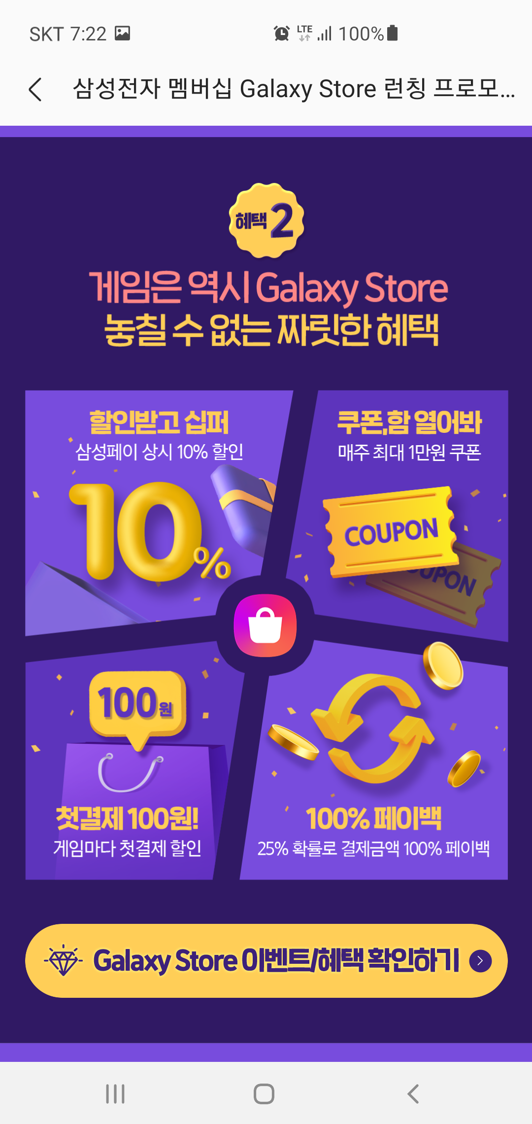 삼성전자 멤버십 특별 혜택 외에도 갤럭시 스토어에서 진행되는 삼성페이 상시 10% 할인 이벤트부터 매주 최대 1만원 할인을 받을 수 있는 쿠폰, 그리고 게임마다 첫결제 할은 100원, 25% 확률로 결제 금액의 100%를 페이백 받을 수 있는 혜택도 주어집니다.