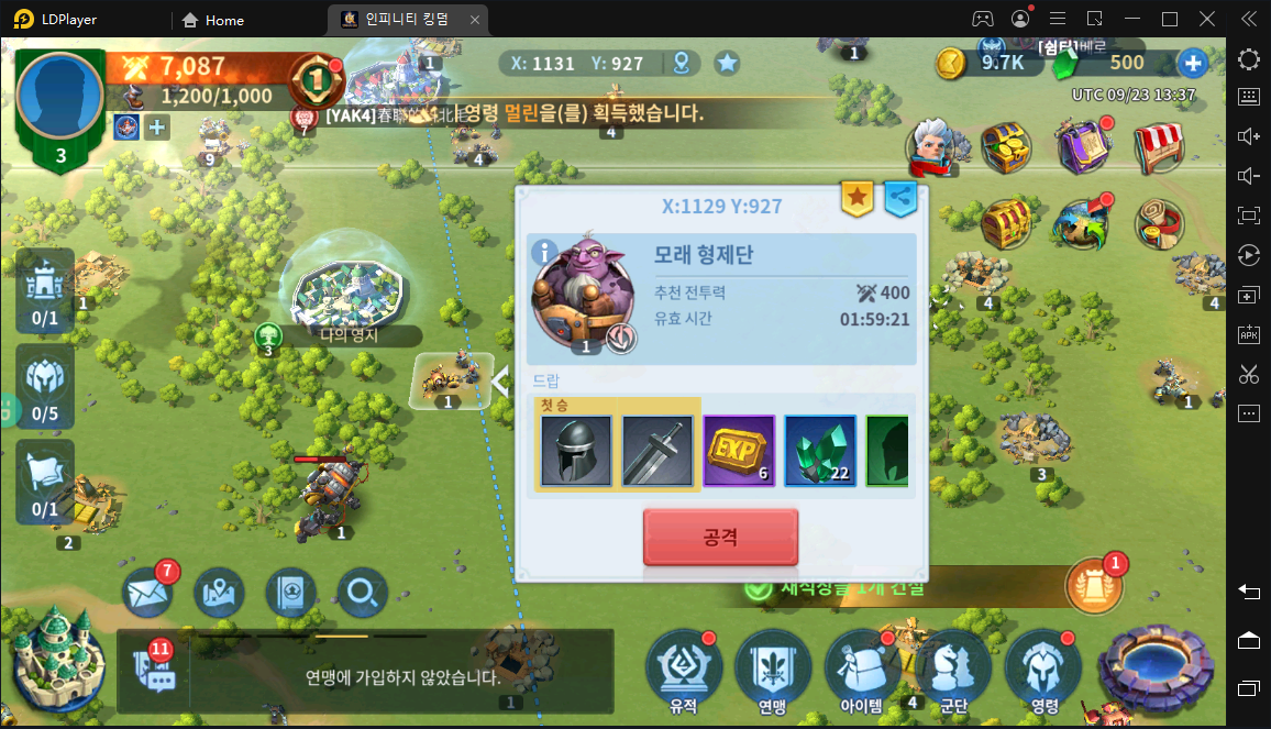 어느 정도 영지 내실을 다졌다면 본격적으로 세계로 나아가 적을 공격하고 사냥에 나설 수 있습니다. 이때 마음이 맞는 유저들과 함께 연맹을 구성하면 적을 공격하거나, 방어에 있어 서로 도움이 될 수 있습니다. 초반에는 방어막이 둘러 쌓여 있어 쉽게 공격받을 수 없어 부지런히 영지를 성장시켜야 합니다.