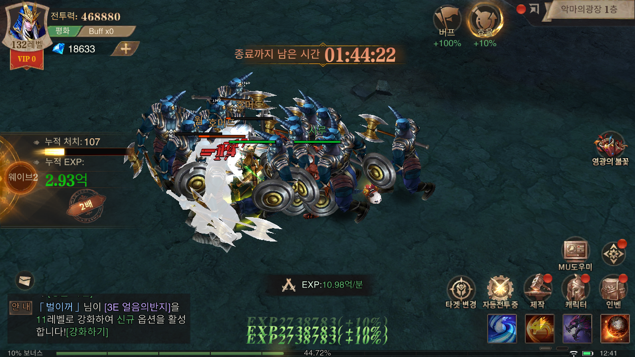 경험치 획득에 있어 악마의 광장이나 블러드 캐슬을 도전할 때 잊지 말아야 점이 있는데요, 바로 버프입니다. 젠과 다이아를 소모해 PVE 대미지를 최대 100%까지 증가시켜줄 수 있어 제한된 시간 내에 보다 많은 몹을 사냥해 획득 가능한 경험치를 늘려줄 수 있기 때문입니다. 50% 까지는 젠 버프를 진행하고, 이후 다이아 버프로 100% 증가를 맞춰주면 캐릭터 경험치 쌓이는 속도가 2배까지 올라가게 됩니다.