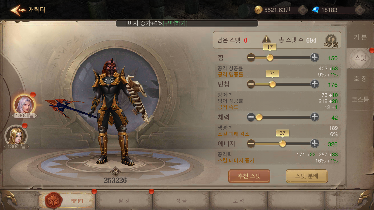캐릭터 레벨이 오를수록 분해해주어야 하는 스탯은 원하는 방향으로 손쉽게 분배 가능합니다. 밸런스 있는 스탯 분배를 원하거나, 큰 고민 없이 한 번에 분배를 진행하고 싶다면, 추천 스탯을 클릭해 일정하게 분배해주는 것도 방법입니다.
