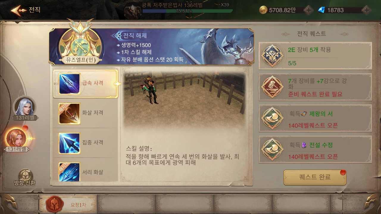 캐릭터가 성장함에 따라 전직도 진행하게 됩니다. 전직은 각 캐릭터마다 다른 특성을 갖게 되기 때문에 본인의 플레이 성향과 전체적인 구성을 감안해 선택하는 것이 좋습니다. 그리고 140레벨 이상 진행 가능한 퀘스트를 포함해 총 4개의 전직 퀘스트를 클리어해야만 최종 전직이 가능합니다.