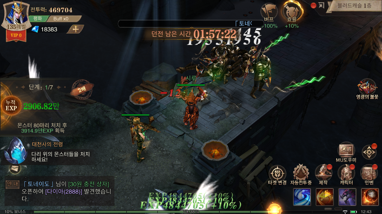 경험치 획득에 있어 악마의 광장이나 블러드 캐슬을 도전할 때 잊지 말아야 점이 있는데요, 바로 버프입니다. 젠과 다이아를 소모해 PVE 대미지를 최대 100%까지 증가시켜줄 수 있어 제한된 시간 내에 보다 많은 몹을 사냥해 획득 가능한 경험치를 늘려줄 수 있기 때문입니다. 50% 까지는 젠 버프를 진행하고, 이후 다이아 버프로 100% 증가를 맞춰주면 캐릭터 경험치 쌓이는 속도가 2배까지 올라가게 됩니다.