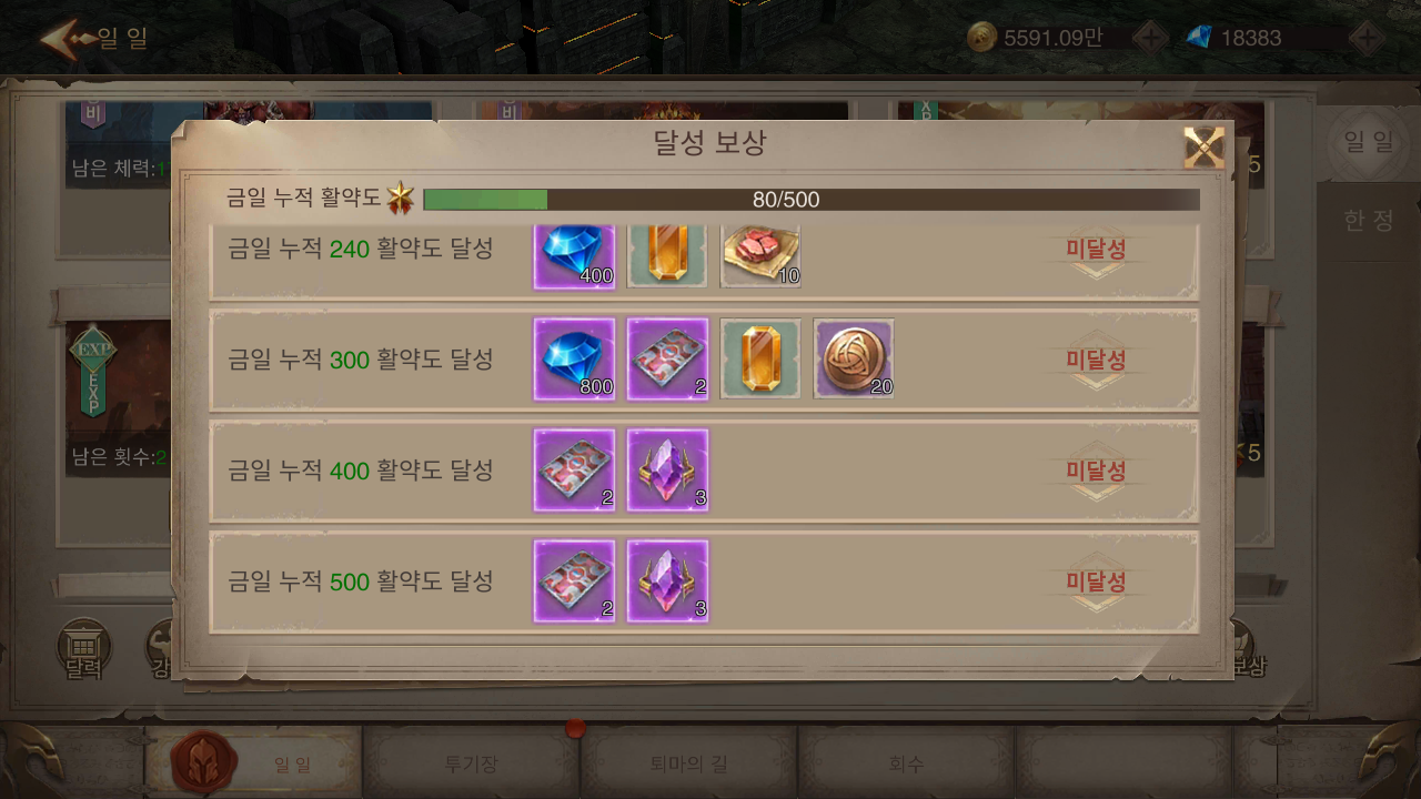 캐릭터 육성에 있어 자동전투와 관문 돌파로 이루어진 점이 장점이지만, 너무 단조롭지 않을까 싶기도 한데요, 주어진 일일 퀘스트를 통해 진행되는 다양한 콘텐츠는 지루 할 틈 없는 캐릭터 육성의 재미를 더해주고 있습니다. 또한 필요한 재화의 경우 플레이만 즐겨도 획득할 수 있는 부분들이 많아 부담 없이 즐길 수 있는 점도 특징입니다.