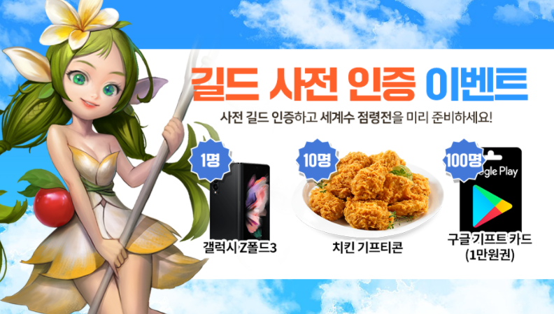 세계수 점령 이벤트 참여를 위해 빠른 길드 생성을 하는 분들을 위한 이벤트도 함께 진행 중입니다. 10월 7일 정식런칭전까지 길드를 구성할 길드원을 모집하고, 카카오톡, 밴드, 디스코드 등으로 기적의 펜디온이 들어간 오픈 채팅방을 개설하여 입장한 오픈 채팅방의 스크린샷을 인증하면 추첨을 통해 구글 기프트카드와 치킨 기프티콘 그리고 갤럭시 Z폴드 3 선물이 주어집니다.