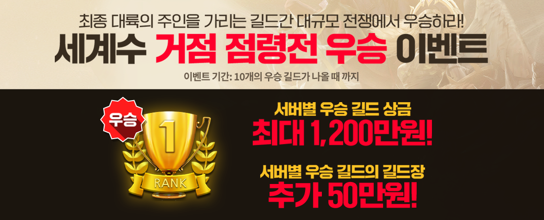 총상금 1억 2천만원 규모의 세계수 점령전은 다른 게임에서 볼 수 없었던 차별화된 길드 이벤트라고 할 수 있습니다. 보통 론칭 후에 시작하여 개인별 전투력을 가늠하는 이벤트가 진행되기 마련인데, 상금 단위부터 다르고, 론칭 전부터 마음이 맞는 유저들과 함께 준비를 할 수 있다는 점에서 흥미진진한 진행이 예상됩니다.