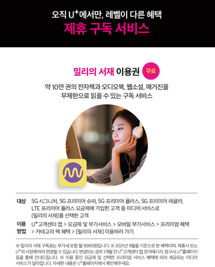 이외에도 유플러스에 받을 수 있는 혜택도 상당합니다. 플러스 요금제 가입한 고객 중 미디어 서비스로 밀리의 서재를 선택한 분들에게는 약 10만 권의 전자책과 오디오북, 웹소설, 매거진 등을 무제한으로 읽을 수 있는 밀리의 서재 이용권을 무료로 사용할 수 있는 혜택이 주어지는데요 평소 전자책을 즐겨 읽는 분들이라면 꼭 선택해야 하는 미디어 서비스이기도 합니다.