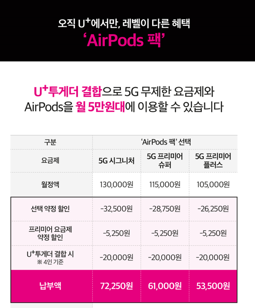 유플레벨업패키지를 선택하면 에어팟 할부금 전액을 할인 받을 수 있습니다. 이때 5G프리미엄 플러스 요금제 이상의 아이폰팩 선택시 제공되며, 프리미엄팩인 넷플러스 팩이나 유튜브 팩은 중복 선택이 불가합니다. 단 가입 후 다른 팩으로 변경 가능하나 변경시 에어팟 할부금 및 할부이자 5.9%는 별도 청구된다고 하는데요, 아이폰13 짝꿍템인 에어팟을 함께 선택하고 싶은 분들에겐 괜찮은 조건인 것 같습니다.