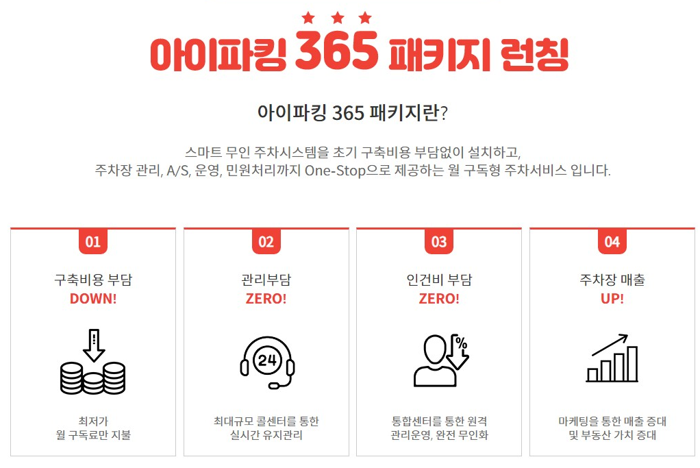 아이파킹 365 패키지의 경우 5년 약정 기준 월365,000원의 비용으로 스마트 무인 주차 시스템을 초기 구축비용 부담 없이 설치 가능하고, 주차관리부터 A/S, 운영, 민원처리까지 원스탑으로 해결할 수 있는 장점을 가지고 있습니다.