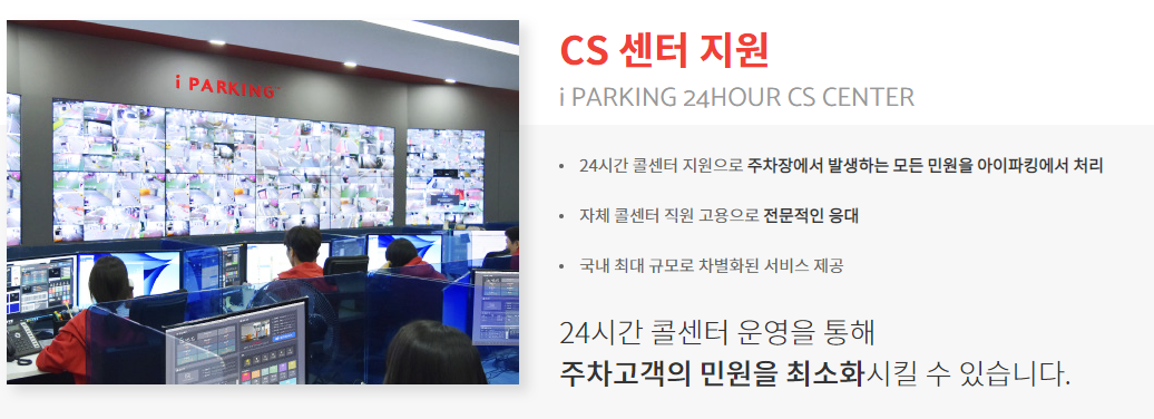 주차장은 관리시간의 제한이 없이 24시간 운영되는 만큼 CS부분도 중요한데요, 아이파킹의 경우 24시간 365일 CS센터 및 클라이언트 전용 상담센터가 지원됩니다. 뿐만 아니라 서버 LPR도입으로 차량번호 인식 기술은 최상의 인식률 및 최고의 인식 환경을 유지하고 있어 여러 환경적인 요인에 의한 차량 번호 인식 불가도 0에 가깝습니다.