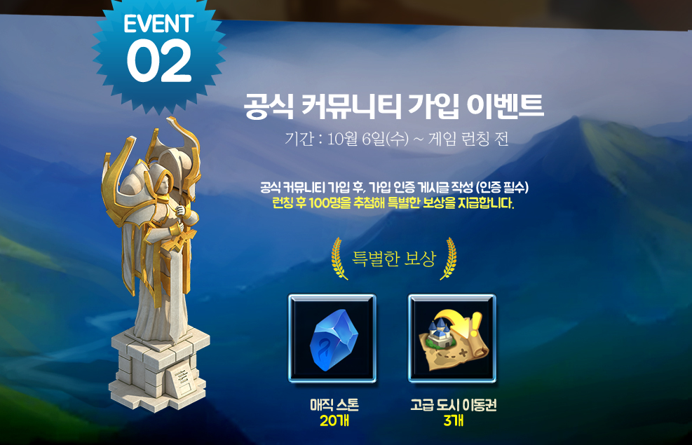 공식 커뮤니티 가입 이벤트도 함께 진행 중입니다. 10월 6일부터 게임 런칭 전까지 공식 커뮤니티에 가입하고 인증글을 작성하면 런칭 후 100명을 추첨해 매직 스톤 20개와 고급도시 이동권 3개가 주어집니다. 또한 이모탈 응원 이벤트로 해당 게시판에 응원글을 남기면 에너지 100 쿠폰을 받을 수 있는 이벤트도 진행 중입니다.
