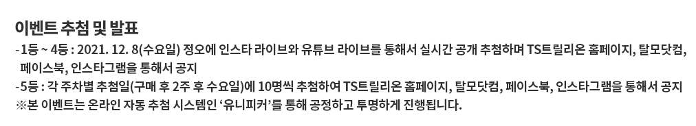 이벤트 추첨과 발표에 있어서도 공정성을 더한 방식으로 진행되는 점이 눈길을 끄는 부분입니다. 1등부터 4등까지 당첨인원의 경우 12월 8일 정오 인스타 라이브와 유튜브 라이브를 통해 실시간 공개 추첨을 진행하는데요, 이번 이벤트는 온라인 자동 추첨 시스템인 유니피커를 통해 공정하고 투명하게 진행된다고 하니 더욱 기대됩니다.