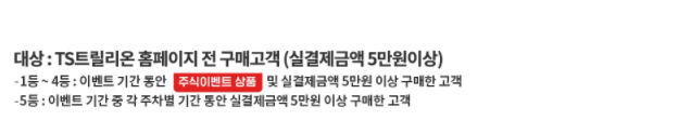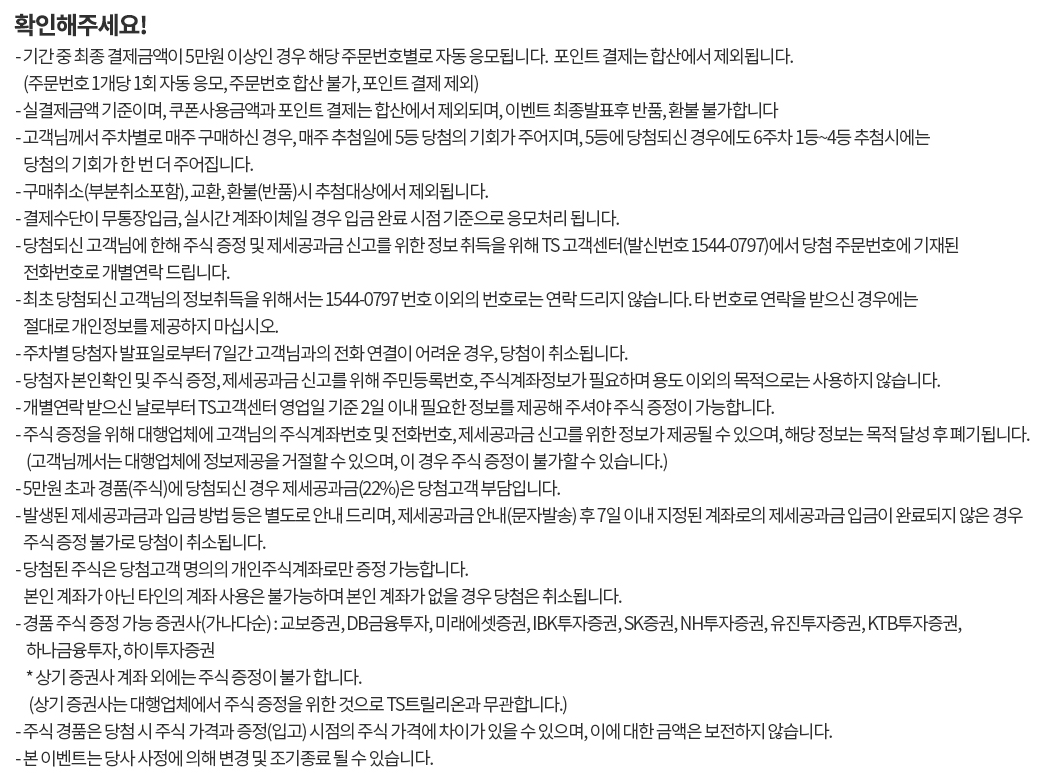 참여 방법은 간단합니다. TS트릴리온 홈페이지에서 이벤트 기간동안 주식 이벤트 상품 표기가 되어 있는 제품을 실 결제금액 5만 원 이상되면 자동 응모되는 방식입니다.