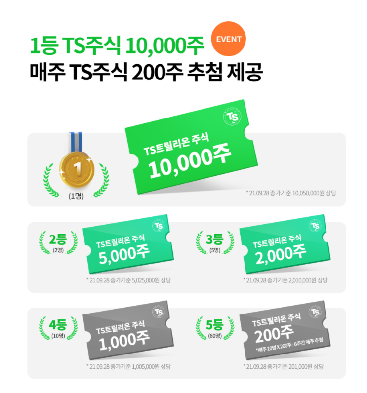TS트릴리온 주주찬스 이벤트에 참여한 분들 중 매 주차별 추첨을 통해 1등에게는 TS트릴리온 주식 10,000주를 증정하고 2등에게는 5,000주, 3등에게는 2,000주 그리고 4등과 5등에게는 각 1,000주와 200주에 해당하는 TS주식을 제공합니다. 주식수에 따른 금액을 환산하면 어마어마하다고 할 수 있는데요, 특히 주식의 경우 일일 평가에 따라 가치가 달라지기 때문에 더욱 특별하다고 할 수 있습니다.
