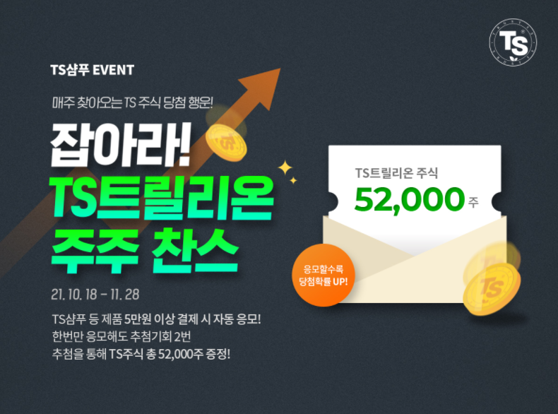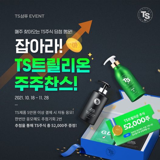 11월 28일까지 진행되는 TS샴푸 이벤트 잡아라! TS트릴리온 주주찬스는 TS샴푸 등 5만 원 이상 결제 시 자동 응모되는 이벤트로 추첨을 통해 TS주식 총 52,000주를 받을 수 있는 특별한 기회를 제공합니다.