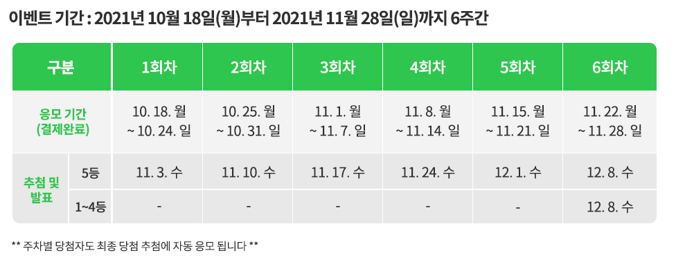 10월 18일부터 시작된 TS트릴리온 주식찬스 이벤트는 1등부터 4등 인원은 최종 12월 8일에 발표하고, 5등 인원은 매 주차별로 발표를 진행하여 기다리는 즐거움을 더해주고 있습니다. 특히 주차별 5등 당첨자도 최종 당첨 추첨에 자동으로 응모된다고 하니 기다리는 시간이 지루하지 않을 것 같습니다.
