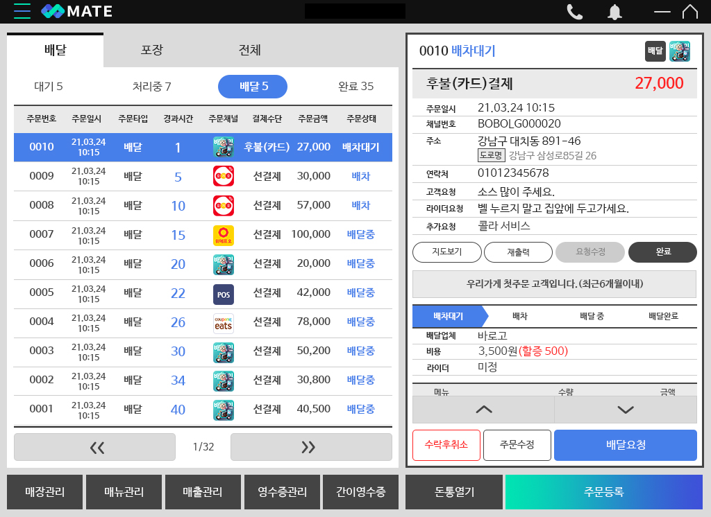 포스프로그램 메이트는 여러 개로 분산되어 있는 배달앱을 통한 주문 접수 프로그램과 배달대행을 위한 프로그램을 개별 관리가 아닌 하나로 단일화된 점이 특징입니다. 온라인 주문 접수를 시작으로 배달 대행사와 연동까지 되어 있어 포스 한대로 편리하게 활용할 수 있습니다.