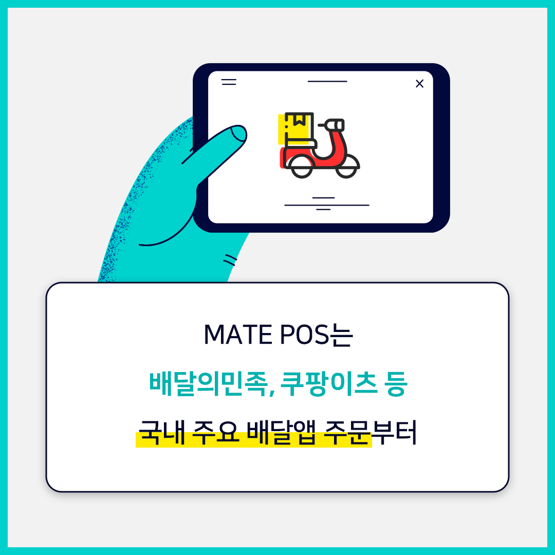 메이트포스는 배달 중심 매장과 내점 중심 매장 어느 곳에서도 최적화된 사용이 가능한데요, 어떤 방식의 운영을 진행하더라도 온. 오프라인 주문 관리를 혼자서도 수월하게 처리할 수 있고, 포스를 처음 사용하는 분들이라도 쉽고 빠르게 적응할 수 있습니다. 지금보다 효율적인 매장 운영을 원하는 분들이나 이제 막 창업을 고민하고 계신 분들이라면, 매출 관리의 첫걸음 메이트 포스와 함께 시작해보시기 바랍니다.