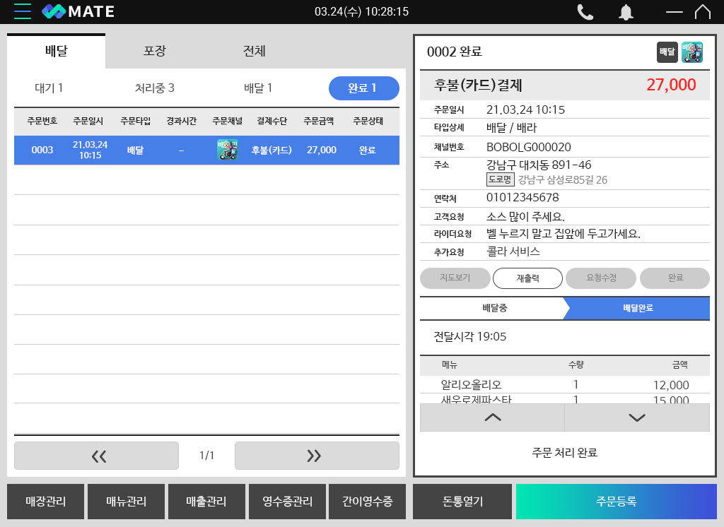 피크타임처럼 바쁜시간에도 별도의 알바 없이 혼자서 주문을 처리할 수 있고, 주문 접수 앱을 매장 밖에서도 사용 가능해 언제 어디서나 간편하게 주문을 접수하는 일부터 배달 호출까지 원스톱으로 가능합니다. 주문처리를 쉽고 빠르게 그리고 편하게 처리 가능한 점은 포스프로그램 메이트를 사용해야 할 가장 큰 이유이기도 합니다.