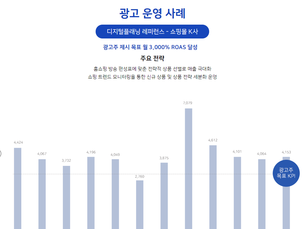 실제 11번가를 통해 진행했던 광고 운영 사례를 살펴보면 광고주가 제시했던 목표치 이상의 광고효과를 달성한 것을 볼 수 있습니다. 특히 셀러가 판매하는 제품과 쇼핑몰에 따라 전략을 달리함으로써 최고의 성과를 이끌어 낸 사례 들을 보면 디지털플래닝의 오픈마켓 광고의 효율이 그냥 지나칠 수 없는 수준이라는 점을 확인할 수 있습니다.