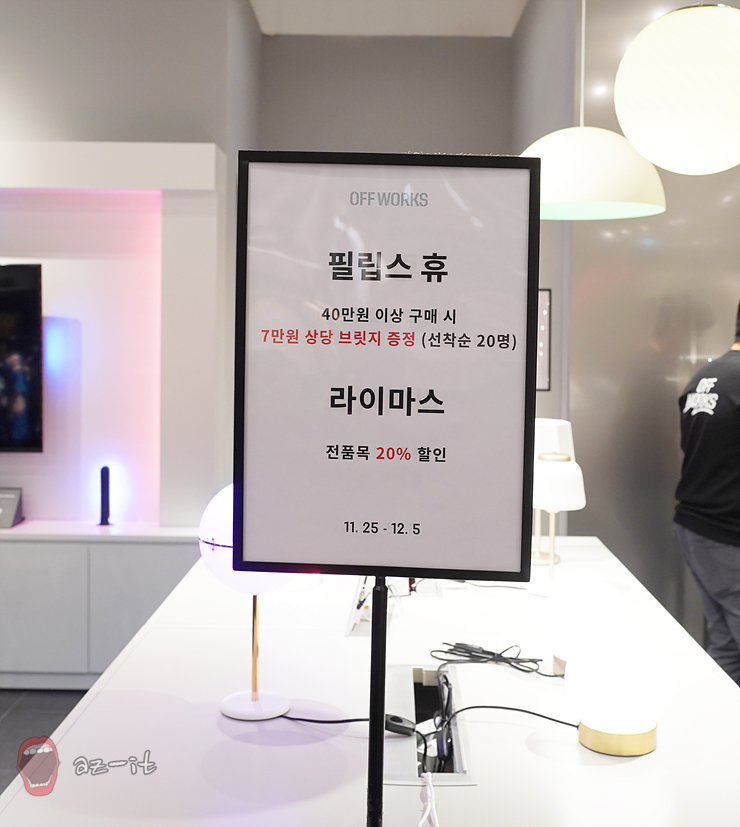 특히 지금 필립스 휴 오프웍스 송도점으로 달려가야 하는 이유! 12월 5일까지 오픈 프로모션이 진행 중이기 때문인데요, 필립스 휴 제품을 40만 원 이상 구매하면 선착순 20명에게 7만 원 상당의 휴 브릿지를 증정하고 있기 때문입니다. 원하는 분위기를 만들기 위해 꼭 필요한 조명. 서둘러 오프웍스 송도점에 방문해 원하는 조명도 구입하고, 프로모션의 혜택도 챙겨보시기 바랍니다.