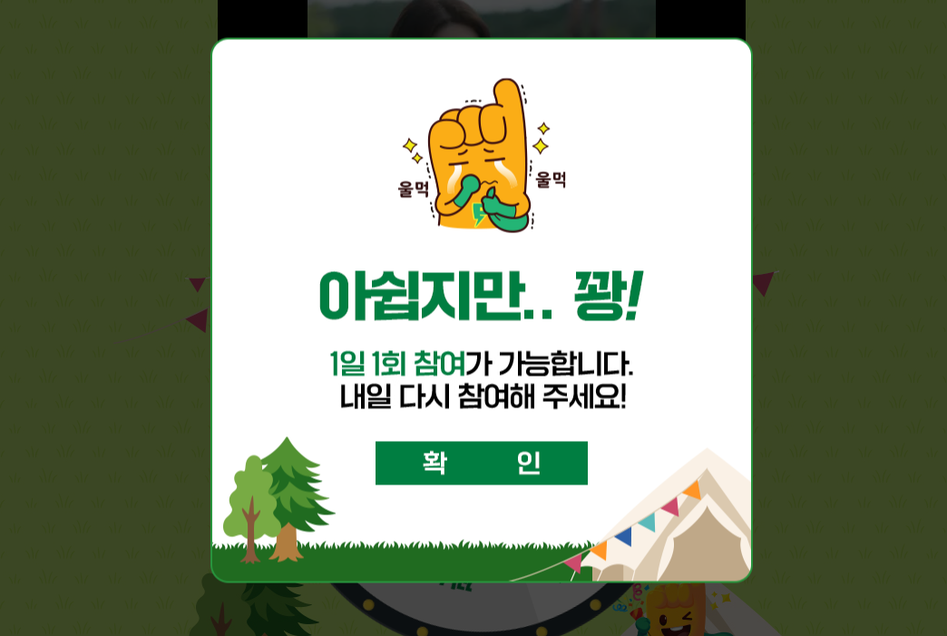 프로미캠핑월드 소개 영상을 보고 필요한 정보를 입력한 후 룰렛을 돌려보았으나. 아쉽게도 꽝에 당첨되었습니다. 1일 1회 참여 가능하고, 이벤트 기간이 아직 남아 있는 만큼 열심히 도전하면 맛있는 선물의 주인공이 될 수 있지 않을까 기대하면서 내일도 도전!