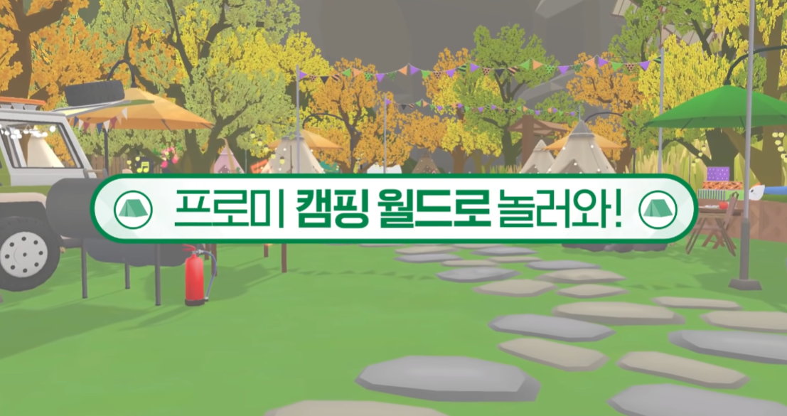 프로미캠핑월드에 접속하면 버스정류장을 시작으로 유익한 안전수칙들을 배워볼 수 있습니다. 어린이 교통안전을 지키는 옐로카펫을 지나 프로미 캠핑월드에 입장하면 안전한 캠핑을 위한 화기 사용에 주의해야 하는 내용들을 확인하고, 직접 사고 현장을 생생하게 체험하고 배워볼 수 있습니다.