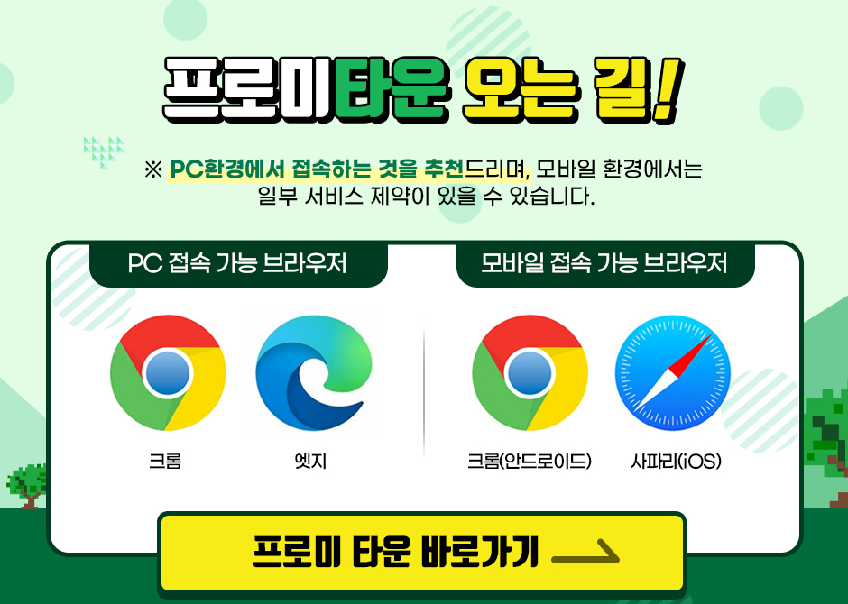 게더타운에 입장하기 위해서는 PC환경에서 접속하는 것이 좋은데요, 크롬과 엣지를 이용하면 별다른 제약 없이 게더타운에 접속할 수 있습니다. 모바일로 접속 시에는 크롬과 사파리를 이용하면 되는데요, 일부 서비스 제약이 있을 수 있습니다.