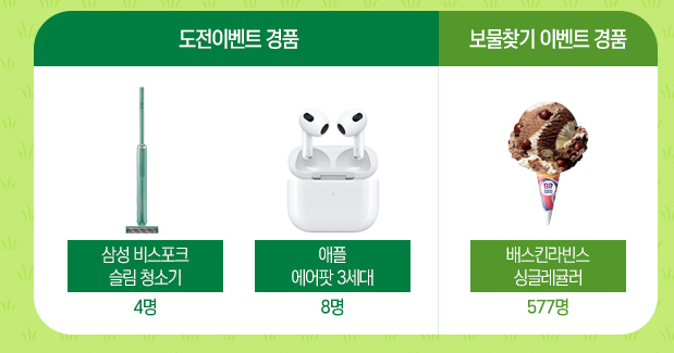 도전이벤트를 통해 삼성 비스포크 슬림 청소기와 애플 에어팟 3세대 경품에 응모할 수 있고,보물 찾기 이벤트에 참여하면 베스킨라빈스 싱글레귤러 선물을 받을 수 있습니다. 재미있게 즐기고 상품도 받아갈 수 있는 만큼 게더타운 프로미타운에 접속해 서둘러 이벤트 놓칠 수 없겠죠?