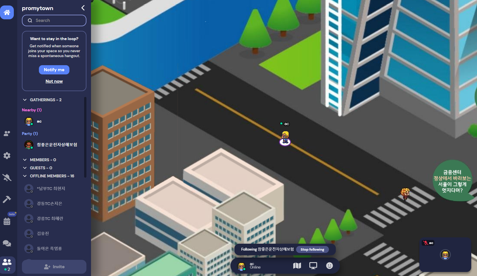 게더타운 프로미월드에 접속하면 곳곳에 위치한 DB금융센터 건물들을 확인할 수 있습니다. 여러 장소에 위치한 캐릭터와 미션을 받을 수 있는데요, 방향키를 이용해 곳곳을 이동하면서 구경하고, 주어진 미션을 클리어하고 참여할 수 있었습니다.