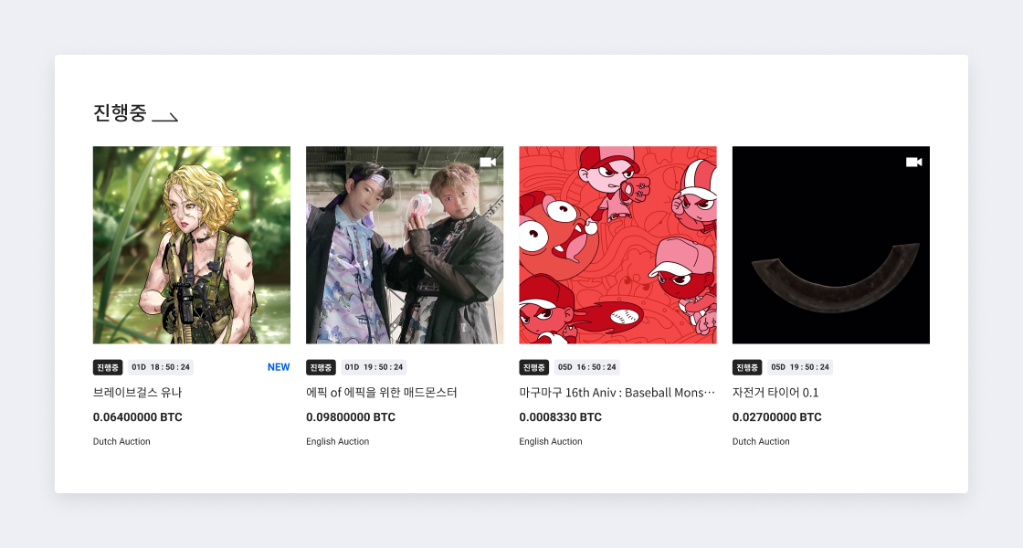 진행 중인 드랍스 리스트에 있는 작품들은 마감시간 내 언제든 입찰이 가능한데요, 고객확인이 완료된 업비트 계정으로 BTC 거래를 통해 입찰이 가능합니다. 경매의 경우 각기 다른 방법으로 진행되며 최고가 입찰 방식인 잉글리시 옥션(English Auction)과 시간이 지날수록 가격이 낮아지는 역경매 방식인 더치 옥션(Dutch Auction) 방식으로 가격이 결정되어 체크가 필요합니다.