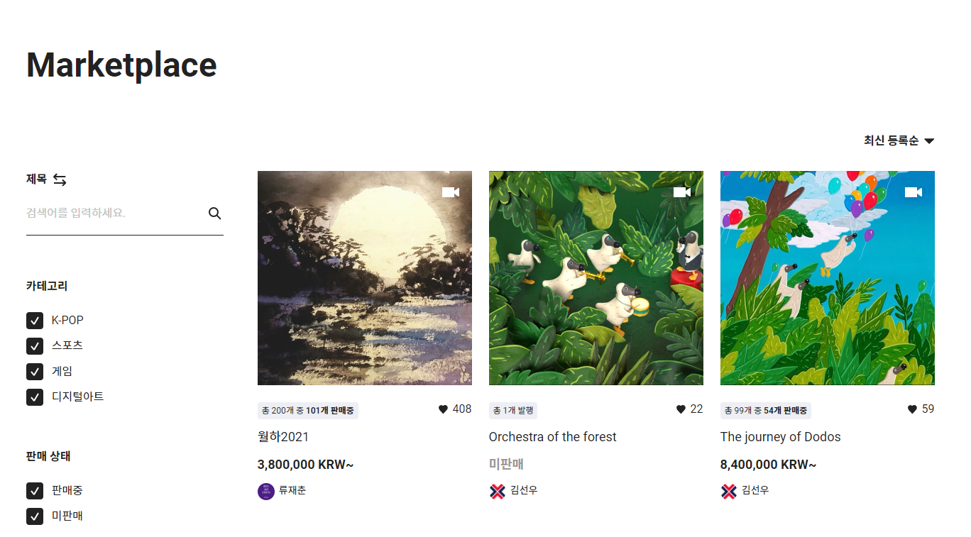 마켓플레이스에서는 앞서 드랍스에서 낙찰 받은 NFT를 포함한 에어드랍등을 통해 받은 NFT를 다른 콜렉터와 자유롭게 사고 팔 수 있도록 준비되어 있습니다. 실제 거래되고 있는 NFT를 둘러보면 정말 다양한 주제를 가진 작품들이 준비되어 있는 것을 확인할 수 있는데요, 상당한 거래가 이뤄지고 있는 모습도 확인 가능합니다.