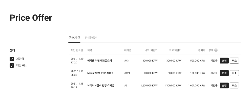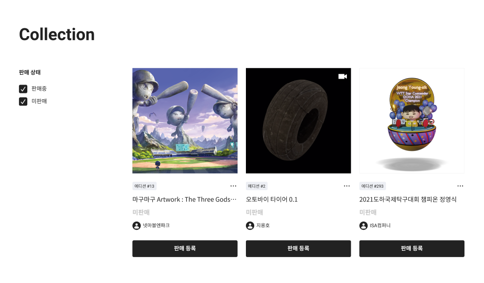 업비트 NFT beta에서 활동한 이력은 마이NFT를 통해 확인 가능합니다. 내가 보유한 NFT를 확인하고 판매를 등록할 수 있는 컬렉션을 시작으로 NFT마켓에서 거래한 내역을 한눈에 확인할 수 있기도 합니다. 특히 내가 판매자에게 제안한 가격을 확인하거나, 구매 희망자로부터 내가 받은 가격 제안을 수락할 수 있어 어렵지 않은 NFT거래가 가능합니다.