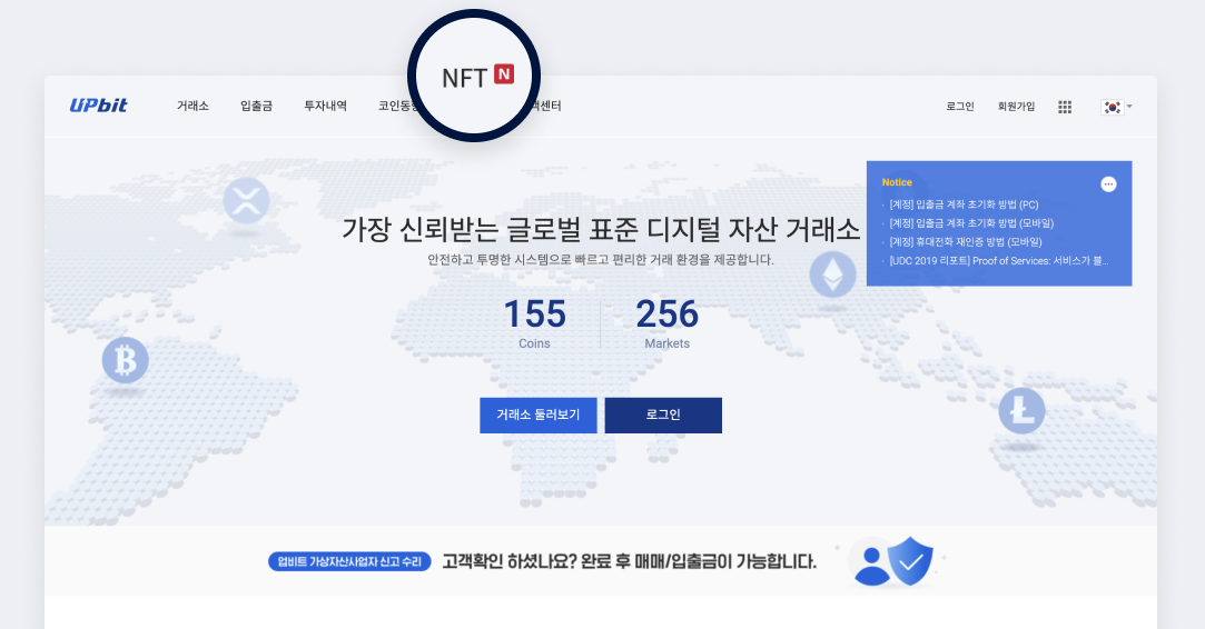 업비트 NFT beta는 업비트에 접속한 후 상단 메뉴에 위치한 NFT를 클릭하여 접속 할 수 있습니다. 현재는 PC에서만 이용 가능합니다.