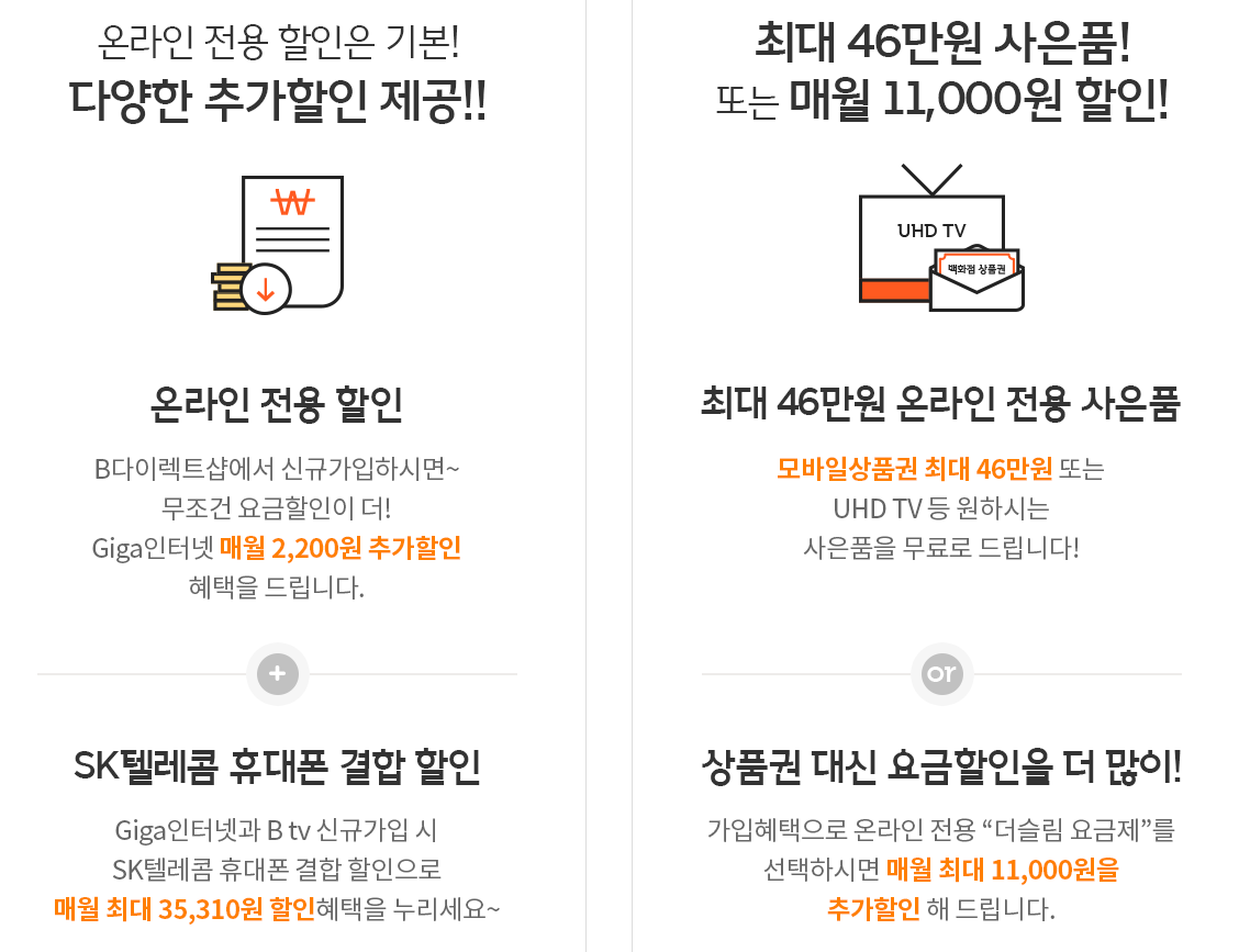 만약 동일한 상품으로 럭셔리한 사은품이 아닌 요금 할인을 받고 싶을 경우에도 SK브로드밴드 공식 온라인샵 B다이렉트샵을 통해 온라인 전용인 더슬림 요금제를 선택하면 매월 최대 11,000원의 비용을 추가 할인받을 수 있어 원하는 개개인에 맞는 선택이 가능합니다.
