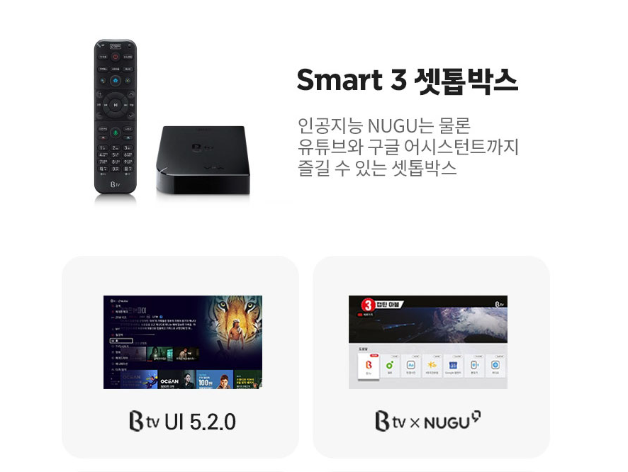 Smart 셋톱박스는 인공지능 NUGU는 물론 유튜브와 구글 어시스턴트까지 즐길 수 있는 셋톱박스로 편리한 사용이 가능합니다. 요금 변동이 없고, 다양한 기능들을 탑재하고 있어 편리하면서도 불편함 없는 활용이 장점입니다. 기본에 충실한 편리함을 원한다면 Smart 셋톱박스가 최고가 아닐까 싶습니다.