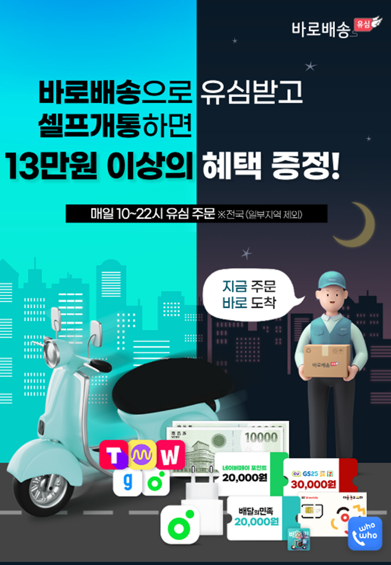 바로 배송으로 유심을 받고 셀프 개통 진행 시 13만 원 이상의 혜택도 받을 수 있는데요, 매일 10시~22시에 주문이 가능하고 주말에도 구입 가능해 저녁에도 제품 배송이 가능한 점이 특징입니다. 무엇보다 개통 시 필요한 유심을 빠르게 받아볼 수 있다는 점이 장점으로 전국 어디서나 가능한 만큼 빠른 개통을 원한다면 챙겨보시길 권해드립니다.