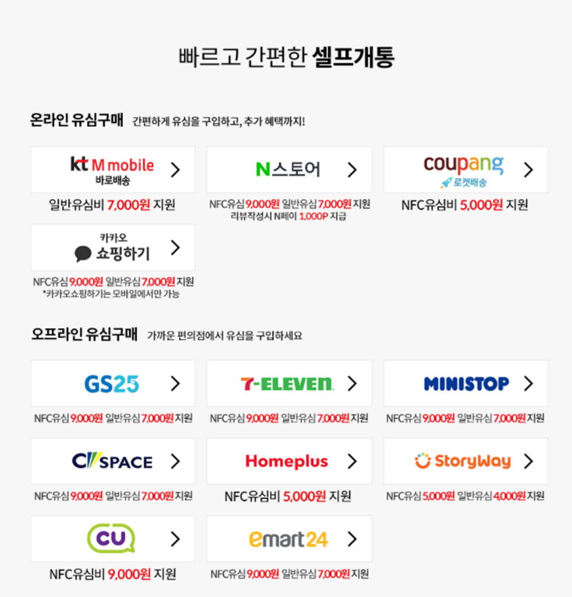 개통의 경우에도 셀프 개통이 가능해 불편함 없이 진행 가능합니다. 온라인사이트인 KT M mobile, N 스토어, 쿠팡, 카카오 쇼핑을 통해 유심을 구입하면 편하게 받을 수 있고 가까운 GS25, 세븐일레븐, 미니스톱에서도 유심을 구매해 빠른 개통이 가능합니다.