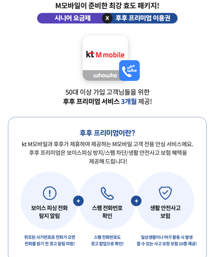 특히 후후 프리미엄 서비스를 3개월 동안 받을 수 있는 점도 장점입니다. 후후 프리미엄 서비스가 적용되면 보이스피싱 전화를 알려주고, 스팸을 차단해주는 것과 함께 이상이나 여가활동시 발생할 수 있는 사고 보장 보험도 10종을 제공받을 수 있어 여러 가지로 유용합니다.