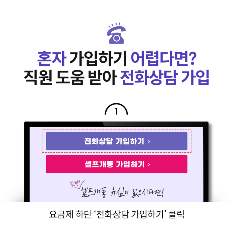 가입도 큰 어려움 없이 진행 가능합니다. 자녀나 지인의 도움을 받지 않아도 전화 상담을 통해 가입이 가능한 점인데요, 전화 상당 가입 버튼을 눌러 이름과 연락처등 간단한 정보를 입력하면 상담원이 전화를 걸어 통화한 후 개통을 할 수 있습니다.