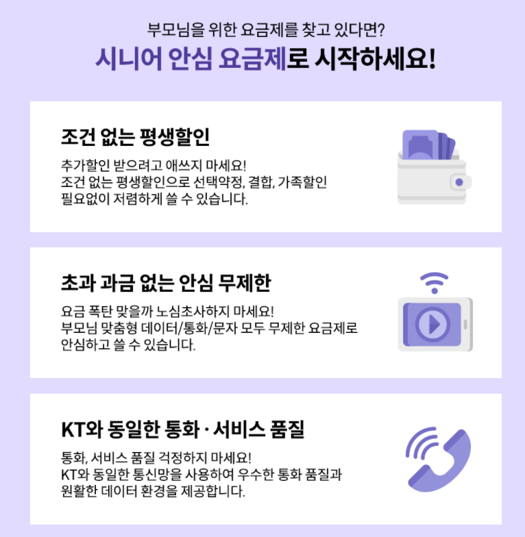 시니어 안심 요금제의 장점은 또 있습니다. 추가 할인 받으려 애쓰지 않아도 조건 없는 평생 할인을 받을 수 있고, 초과 과금 없는 안심 무제한으로 요금 폭탄 걱정 없이 사용 가능합니다. 또한 KT와 동일한 전화 통화 품질화 서비스 품질을 제공받을 수 있고 쉽고 간편한 가입이 특징입니다.