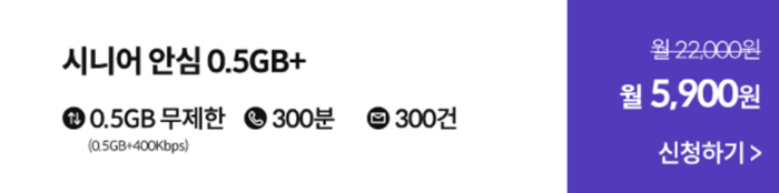 만약 데이터 사용이 크지 않는 분들이라면 시니어 안심 0.5GB 요금제가 준비되어 있어 선택 가능합니다. 월 5천원대 비용으로 음성통화 300분, 문자 300건 데이터 0.5GB 무제한 사용이 가능한데요, 월 5천 원대 혜택이지만 주어지는 모든 프로모션 사은품은 다 받을 수 있어 합리적인 선택이 가능합니다.