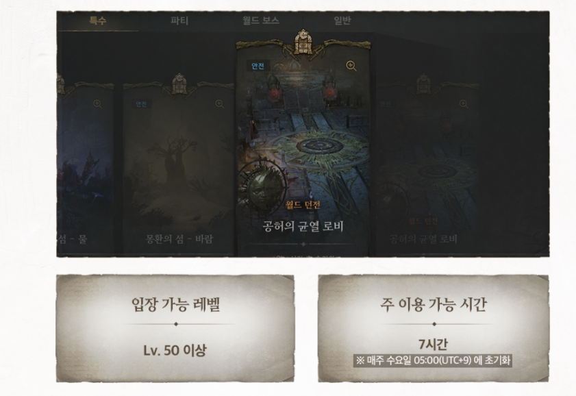 월드 던전인 만큼 모든 입장 가능한 레벨과 주 이용 가능시간이 정해져 있습니다. 공허의 균열 입장은 50 레벨 이상만 가능하며, 정기점검이 있는 매주 수요일 05:00을 기점으로 주 7시간 이용이 가능합니다.