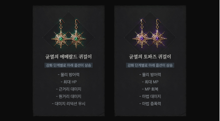 보스 몬스터가 아니더라도 공허의 균열 일반 몬스터가 주는 균열의 귀걸이는 욕심을 내어도 좋을 것 같은데요, 공허의 균열 1층 1~4구역, 2층에 등장하는 몬스터를 사냥하면 확률에 따라 에메랄드/토파즈 귀걸이를 획득할 수 있으니 열심히 사냥을 다녀야 할 것 같습니다.