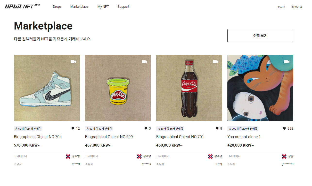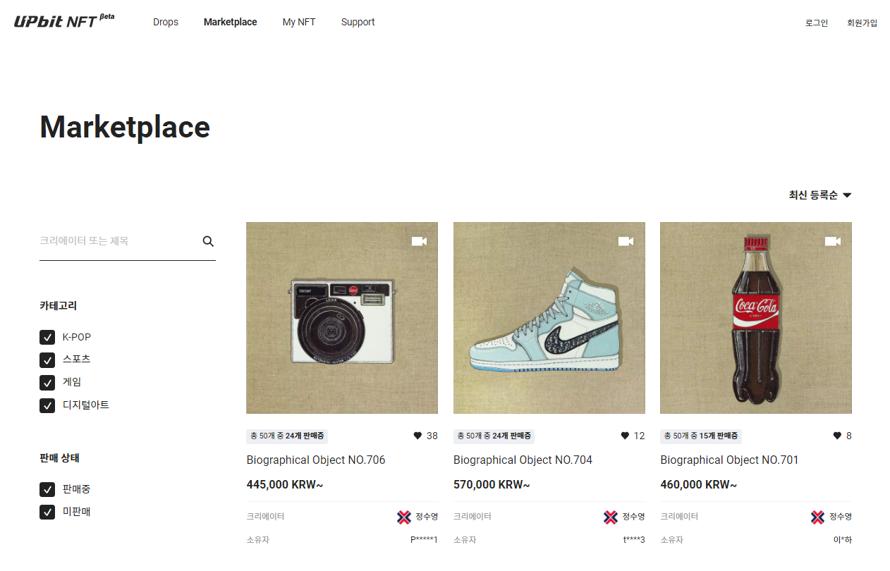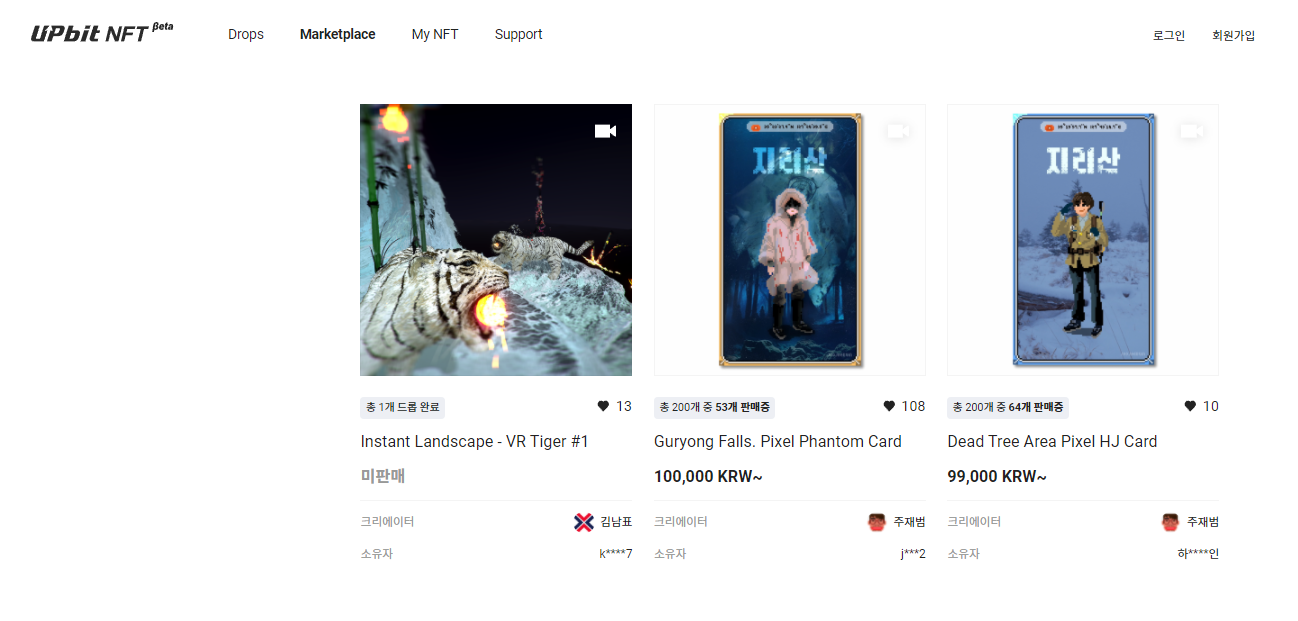 업비트 NFT Beta에서는 드롭스와 마켓플레이스로 불리는 두가지 마켓을 제공하고 있어 경매를 통한 NFT를 소유하거나, 다른 콜렉터와 자유로운 거래를 진행할 수 있기도 합니다.