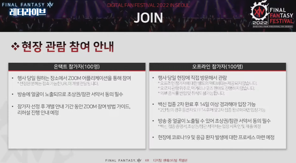2월 12일에 진행되는 팬페스티벌의 경우 코로나 여파로 인해 오프라인 참가자 100명, 온택트 참가자 100명으로 인원을 한정하고, 그 외 인원은 스트리밍 방송을 통해 함께 할 수 있도록 준비되었습니다. 오프라인 참가자와 온택트 참가를 못한다고 하더라도 스트리밍을 통해 누구나 쉽게 즐길 수 있는 만큼 2월 12일 진행되는 파이널판타지14 팬페스티벌을 기대해도 좋을 것 같습니다.