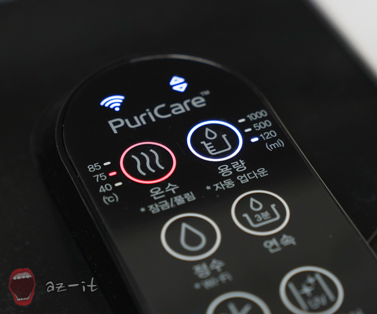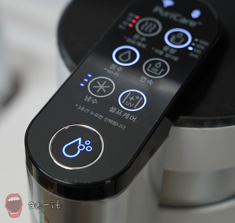 온수 기능이 잠겼다면 상기 영상처럼 버튼에 아무런 불도 들어오지 않고, 눌러도 소리만 날뿐 선택이 되지 않습니다. 이럴 때는 온수 버튼을 3초간 눌러주면 잠금이 해제되면서 온도 표시 불이 들어오고 온수 사용이 가능합니다.