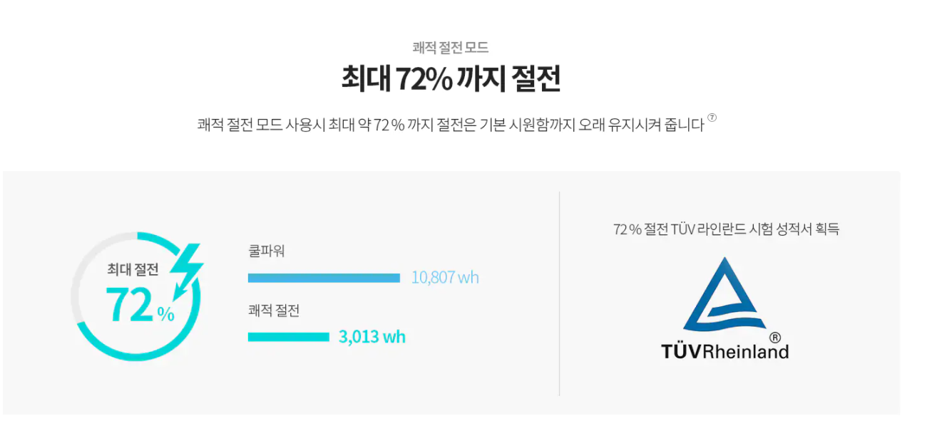 사계절 가전제품인 만큼 전기세를 고민하지 않을 수 없는데요, 2022년형 에어컨 ‘LG 휘센 타워’의 경우 쾌적 절전모드를 사용할 경우 실내 온도 유지와 동시에 최대 냉방모드 대비 약 72%를 절전해 전기료 걱정없이 사용이 가능합니다. 실제 사용 기준 TUV 라인란드 공식 인증까지 받아 더욱 믿을 수 있어요!