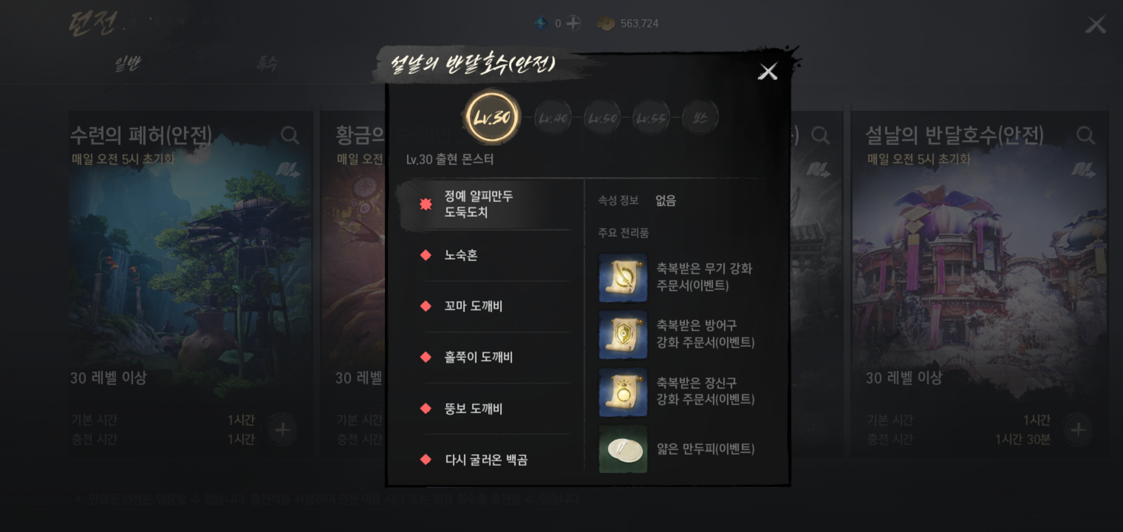 설날의 반달호수에는 정예 얄피만두 도둑도치를 포함해 노숙혼, 꼬마 도깨비, 홀쭉이 도깨비등이 등장하는데요, 설날 만두 레시피 제작 재료인 얇은 만두피를 획득할 수 있고, 정예 얄피만두 도둑도치 사냥에 성공할 경우 축복받은 방어구 강화 주문서를 포함해 축복받은 무기 강화 주문서(이벤트), 축복받은 장신구 강화 주문서(이벤트)까지 노려볼 수 있습니다.